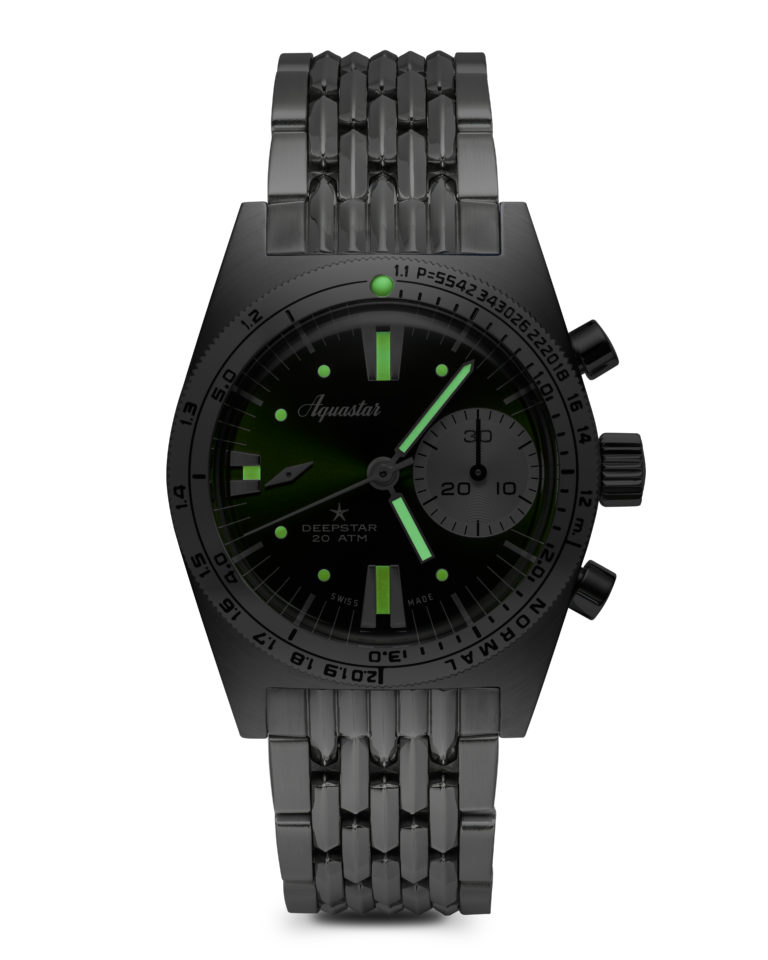 In the summer of 2020, on the heels of relaunching the venerable Aquastar name, we introduced a very limited run of the Deepstar Chronograph in a dynamic “Greenwich” sunburst dial — a bold, classically vibrant reference that sold out in very short order. Now for everyone who asked for us to bring the Greenwich back, we’ve done just so, and once again in limited capacity, but this time we’re offering the Greenwich dial in our newest 39mm Deepstar Chronograph case — a mid-sized reference that faithfully adheres to the function-first ethos and proportions of the pioneering Deepstar Chronograph from 1962 while retaining two of Aquastar’s key identifiers: the bidirectional rotating timing bezel with the brand’s unique “no decompression” table used to time repeated dives (the only one of its kind), and also the emblematic “cyclops” style mono-compax counter, originally devised by Aquastar founder and innovator Frederic Robert.