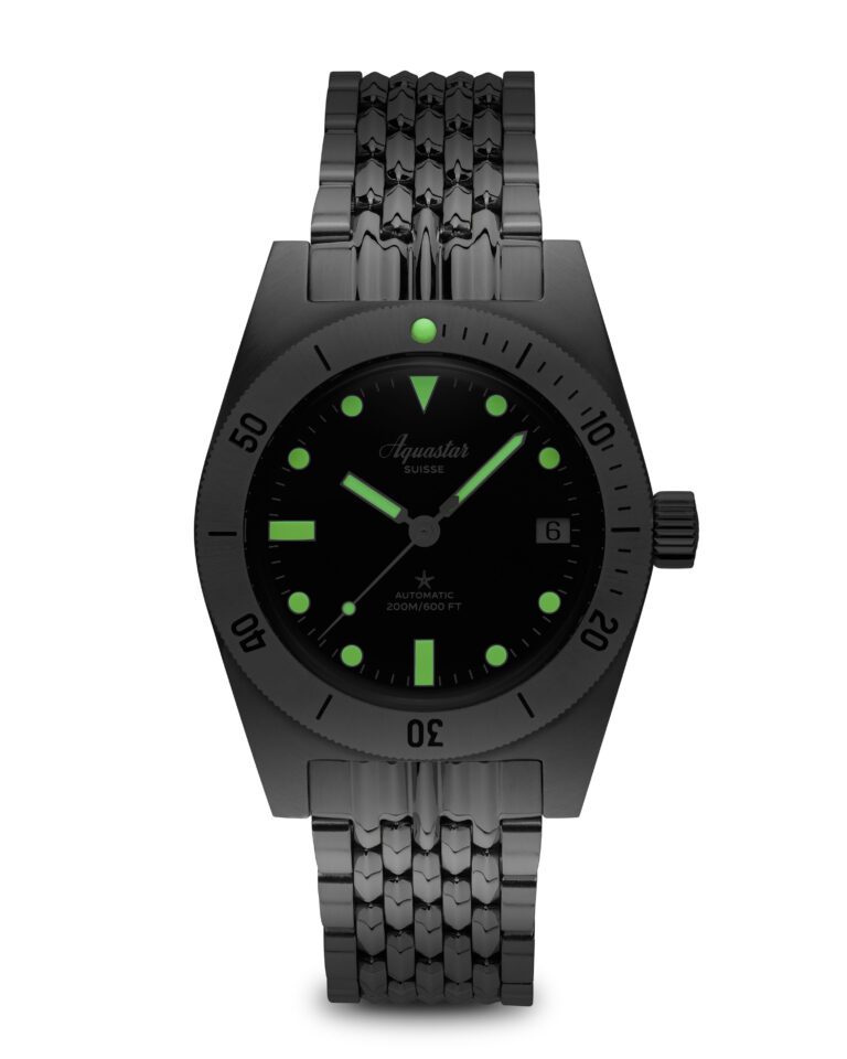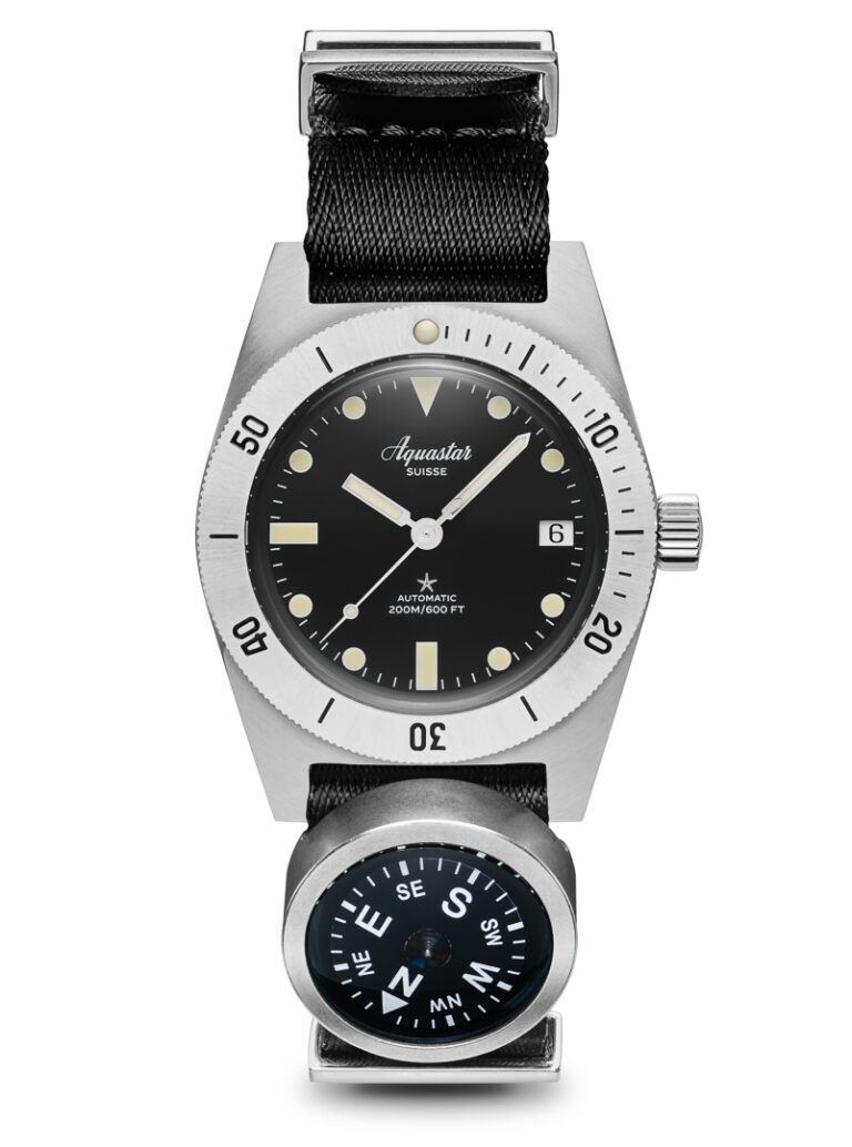 Thoughtfully sized in a 37mm stainless steel case the Model 60 is a somewhat unique reference in the deep Aquastar archive, as it follows a more traditional dive watch execution, using bold hour markers and lume-filled paddle hands, a 60 minute rotating bezel, and a center-mounted seconds hand, eschewing the bold asymmetrical dial elements that would characterize later Aquastar watches, like the iconic Deepstar Chronograph. In keeping with Aquastar’s modern traditions, the new Model 60 maintains a robust 200 meters of water resistance, and is powered by an Elabore top-grade, 100% Swiss Made Sellita SW200 automatic movement with 38 hours of power reserve, a solid ball bearing rotor and the sophisticatedly engineered shock protection system. The Aquastar model 60 comes on a choice of straps and bracelets. A seatbelt NATO, a genuine or a beads of rice stainless steel bracelet.