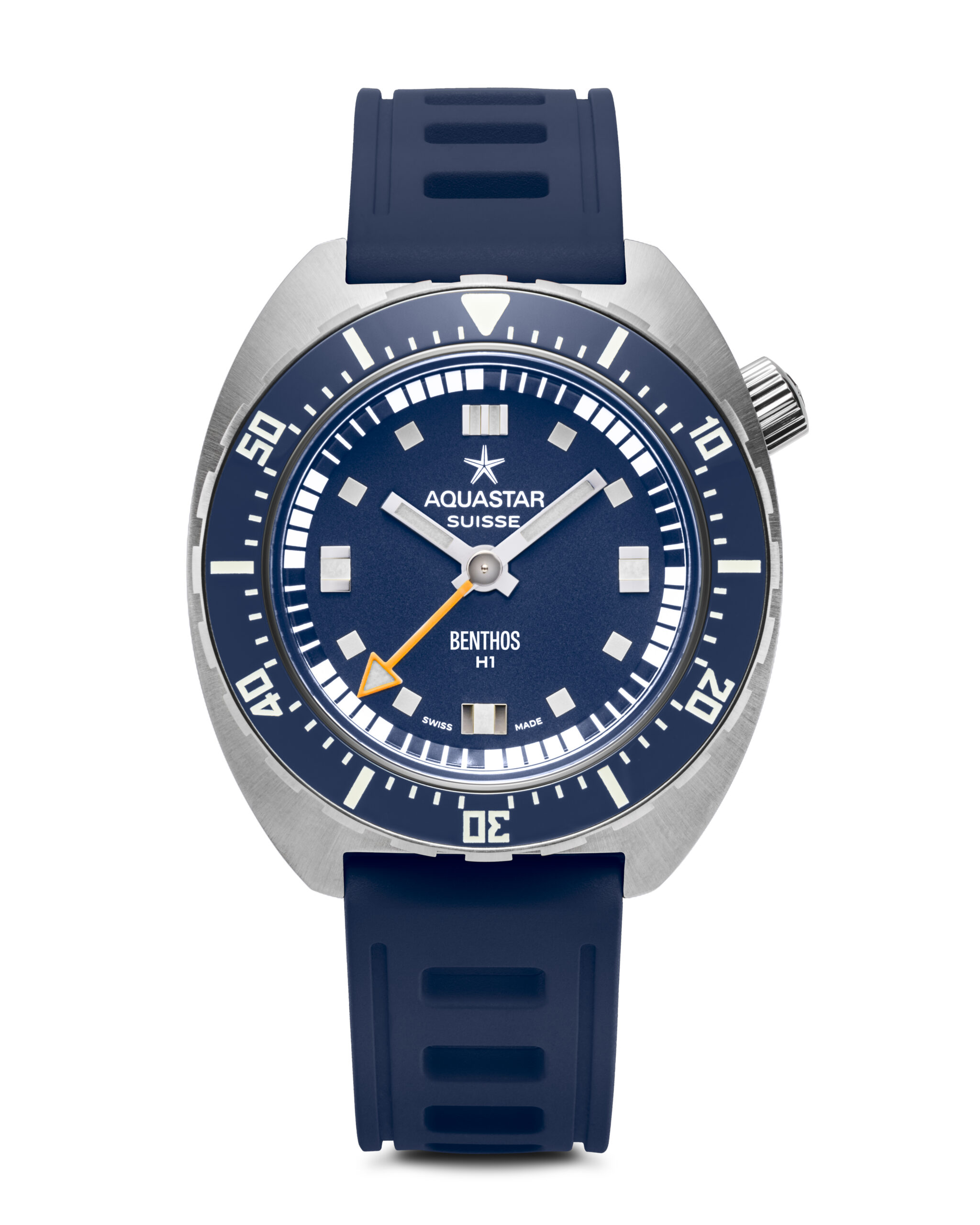 The new Benthos H1 blue Edition continues Aquastar’s earliest traditions of building innovative and ultra-capable tool watches that could cater to the needs of mariners, professional divers, and ocean conservationists. And while the original Benthos was known for its impressive depth resistance and unique center-mounted chronograph functionality, the H1 retains the marked capability and signature crown position of the Benthos but in a more streamlined and economical time-only format.