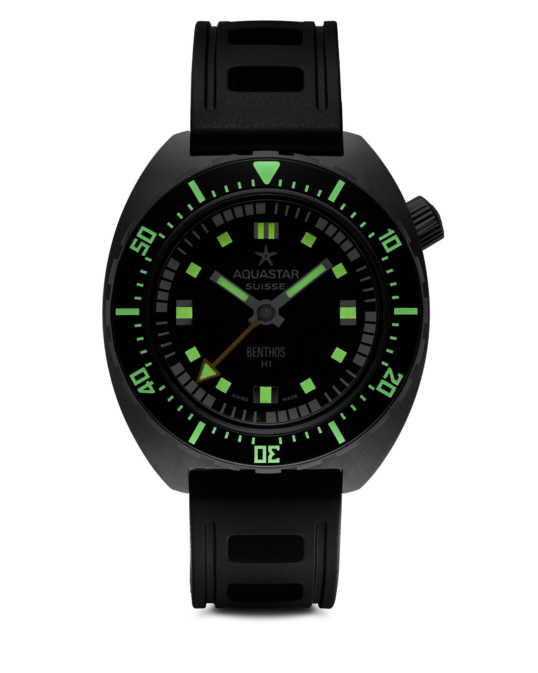 The new Benthos H1 continues Aquastar’s earliest traditions of building innovative and ultra-capable tool watches that could cater to the needs of mariners, professional divers, and ocean conservationists. And while the original Benthos was known for its impressive depth resistance and unique center-mounted chronograph functionality, the H1 retains the marked capability and signature crown position of the Benthos but in a more streamlined and economical time-only format.