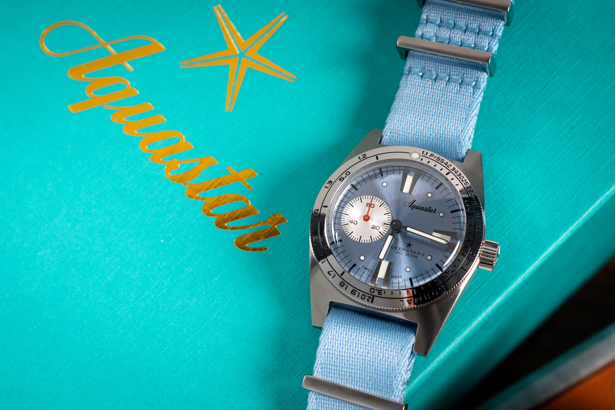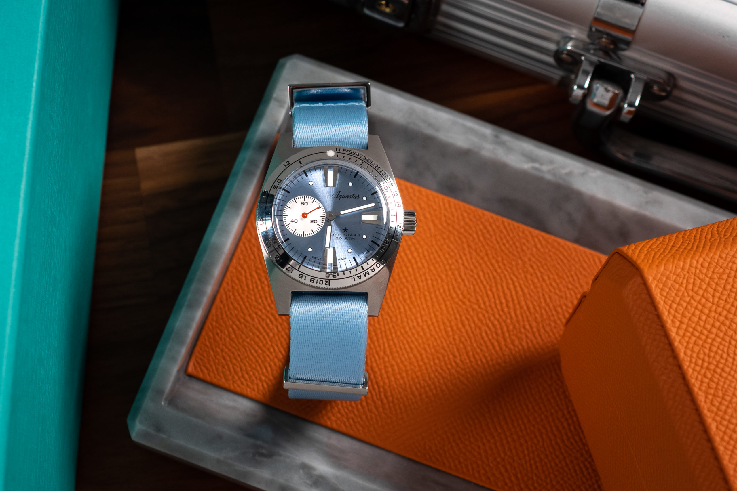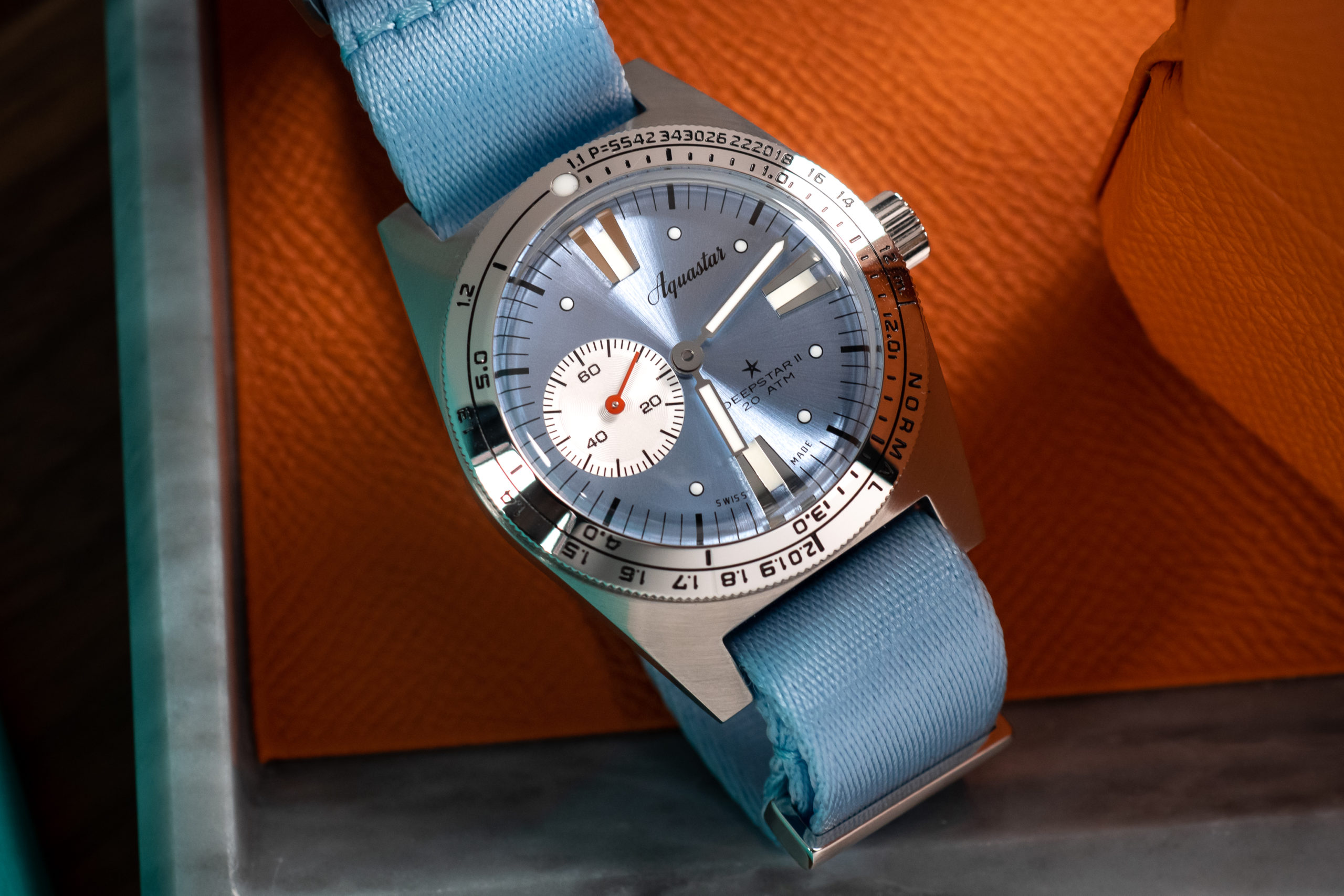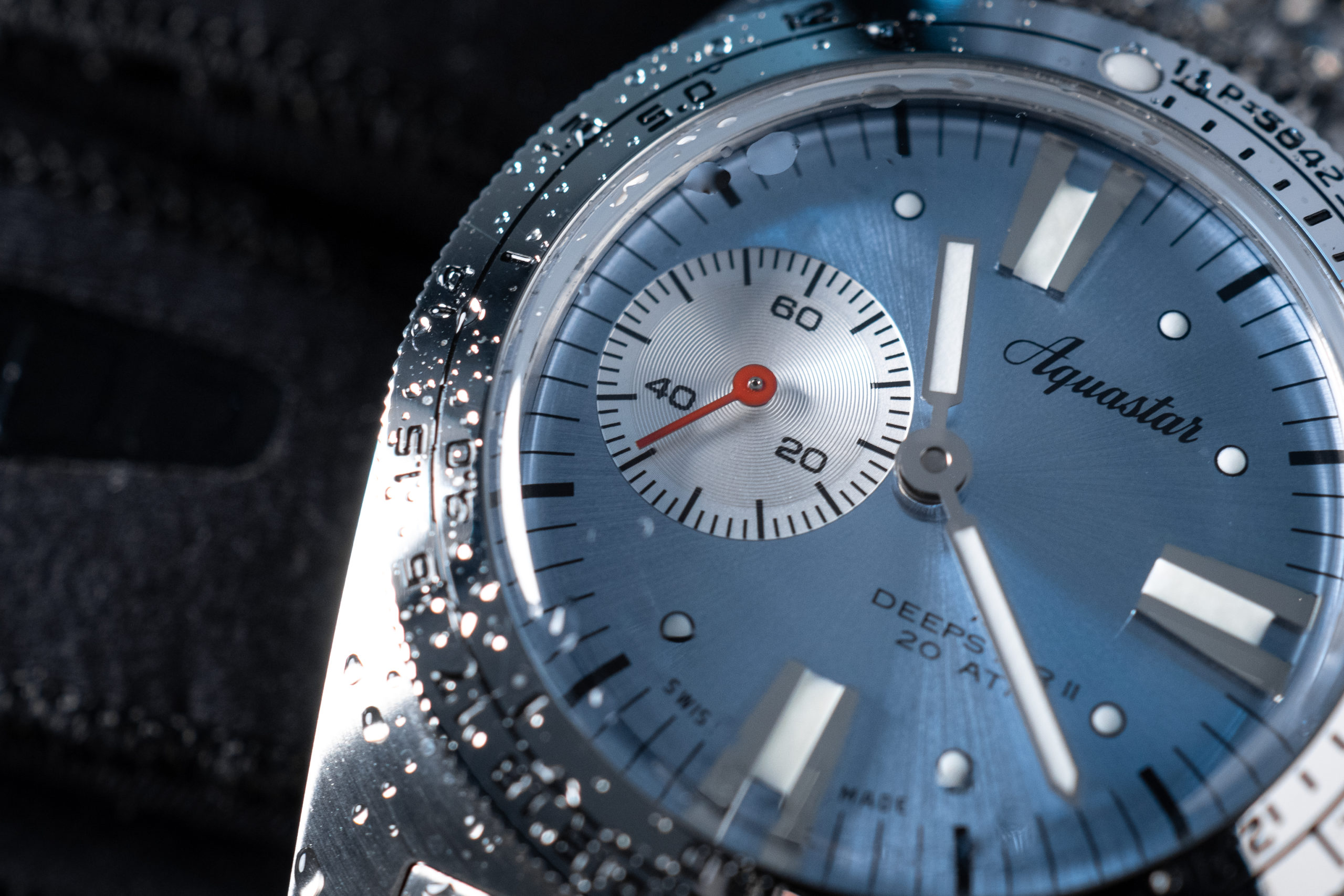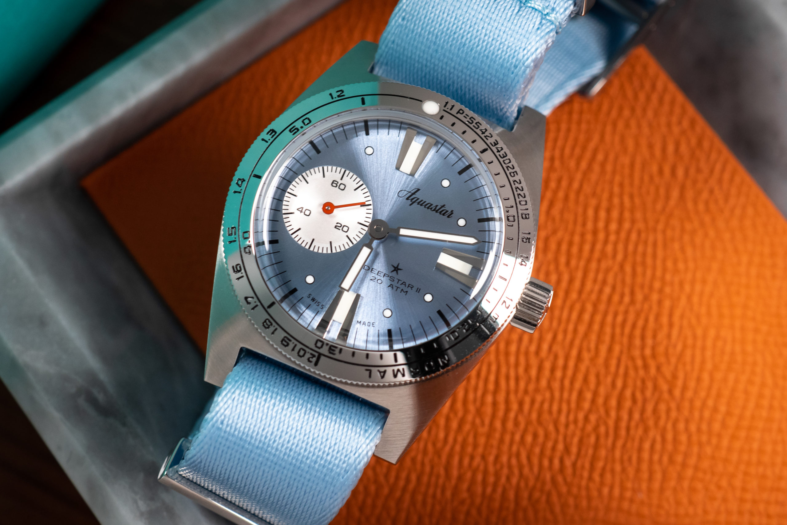 The Fratello × Aquastar Deepstar II Limited Edition has an ice-blue sunburst dial, which is complemented by a red hand on the small seconds sub-dial. Light blue may be incredibly popular today, but the tone wasn’t chosen simply to adhere to current trends; after all, most of the Aquastar releases focus on using darker colors. The cool ice-blue hue will stand the test of time because it works so well with the overall design and becomes oddly versatile for such a light shade. Another distinct difference of the Fratello limited edition is the use of white Super-LumiNova instead of the “old radium” lume used on prior models. This helps lend a more modern feel to the watch and should also satisfy those who desire a fresh look.