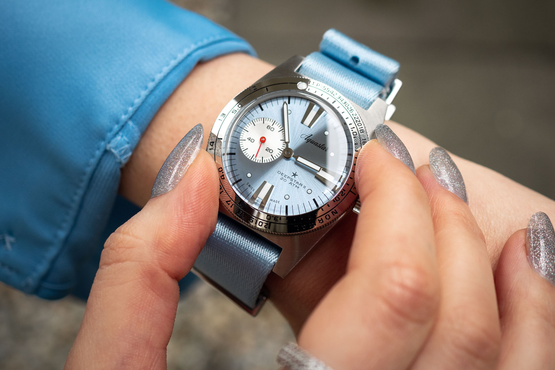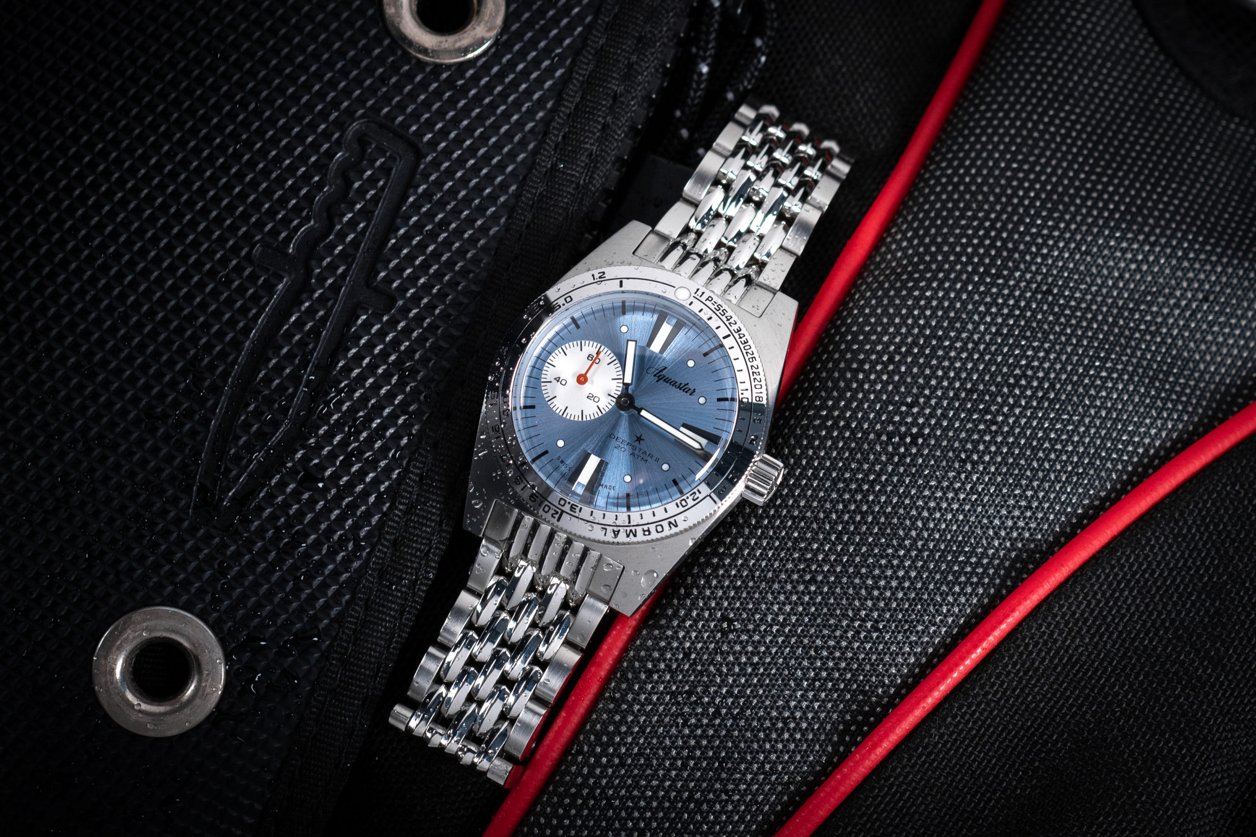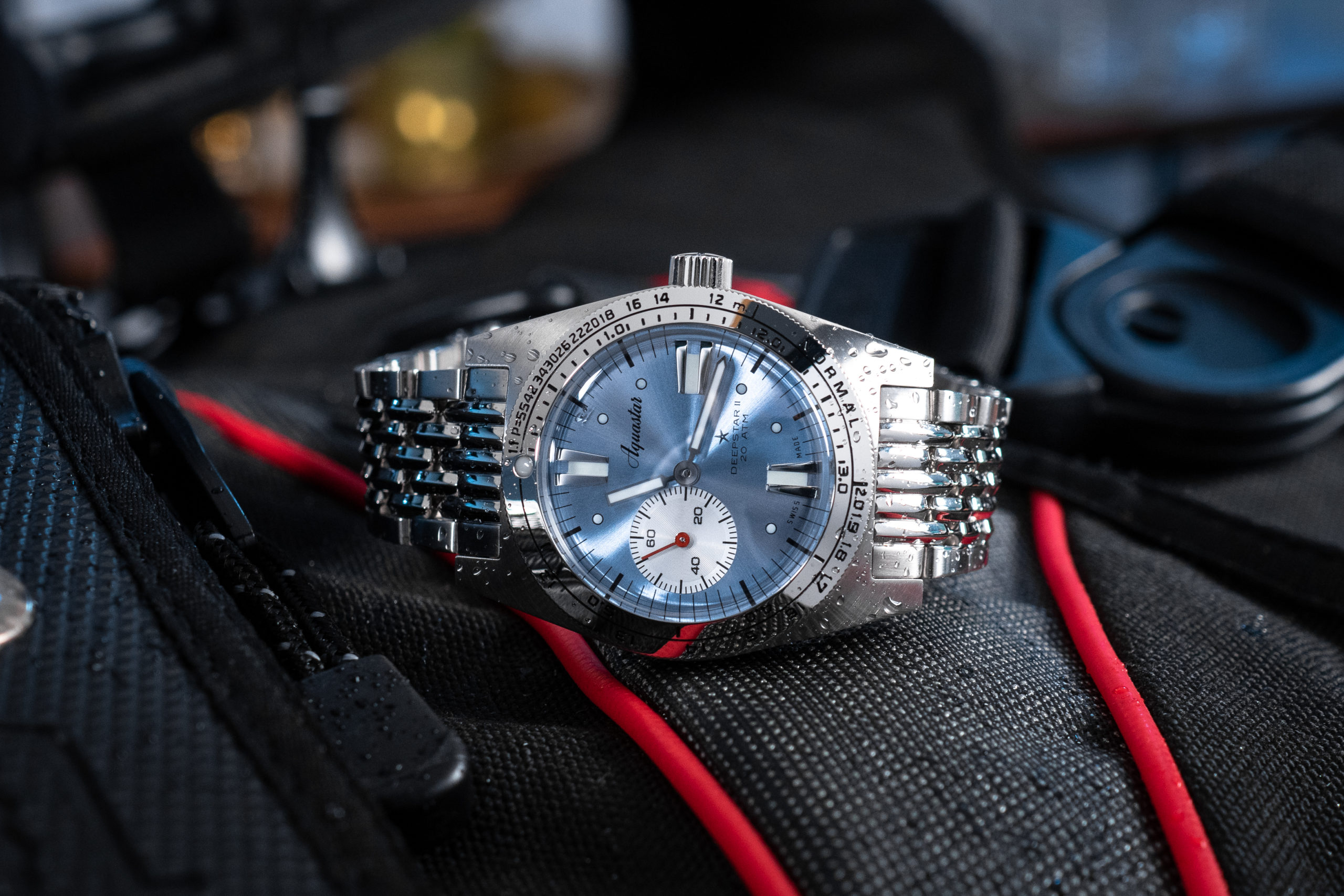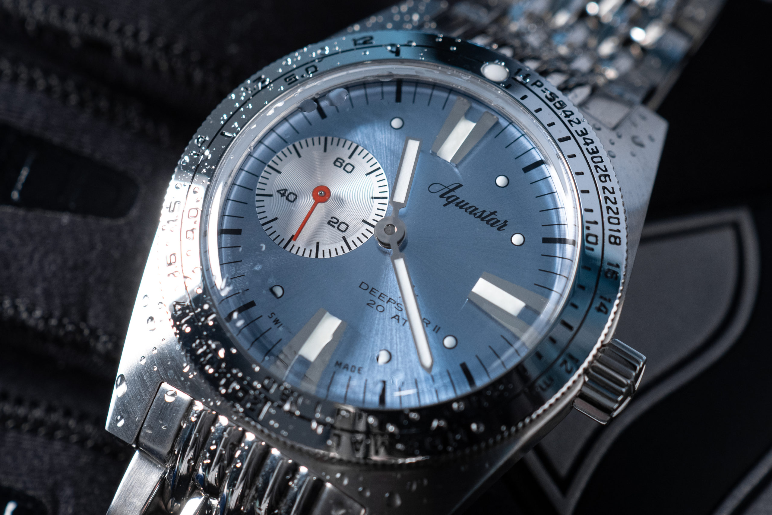 The Fratello × Aquastar Deepstar II Limited Edition has an ice-blue sunburst dial, which is complemented by a red hand on the small seconds sub-dial. Light blue may be incredibly popular today, but the tone wasn’t chosen simply to adhere to current trends; after all, most of the Aquastar releases focus on using darker colors. The cool ice-blue hue will stand the test of time because it works so well with the overall design and becomes oddly versatile for such a light shade. Another distinct difference of the Fratello limited edition is the use of white Super-LumiNova instead of the “old radium” lume used on prior models. This helps lend a more modern feel to the watch and should also satisfy those who desire a fresh look.