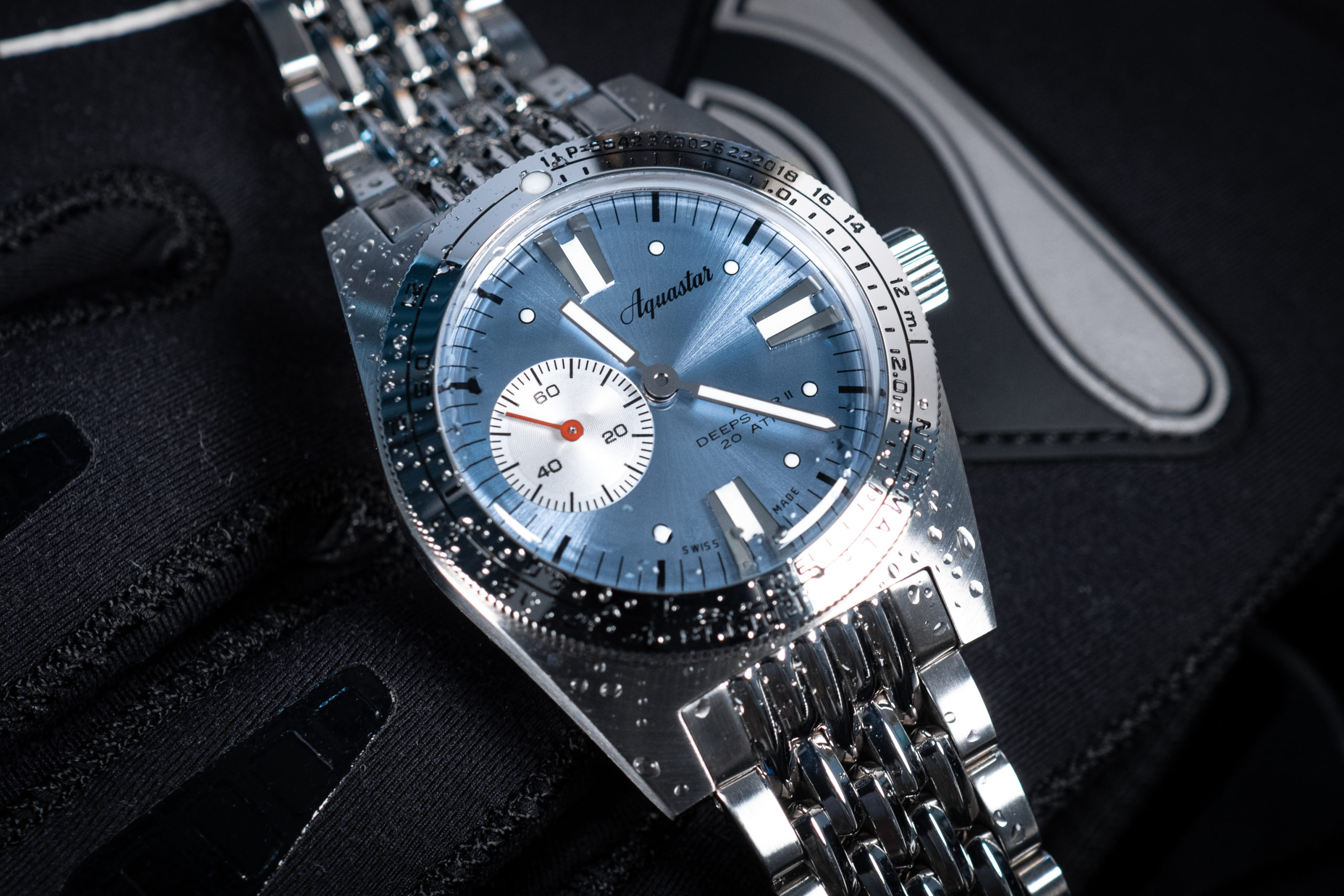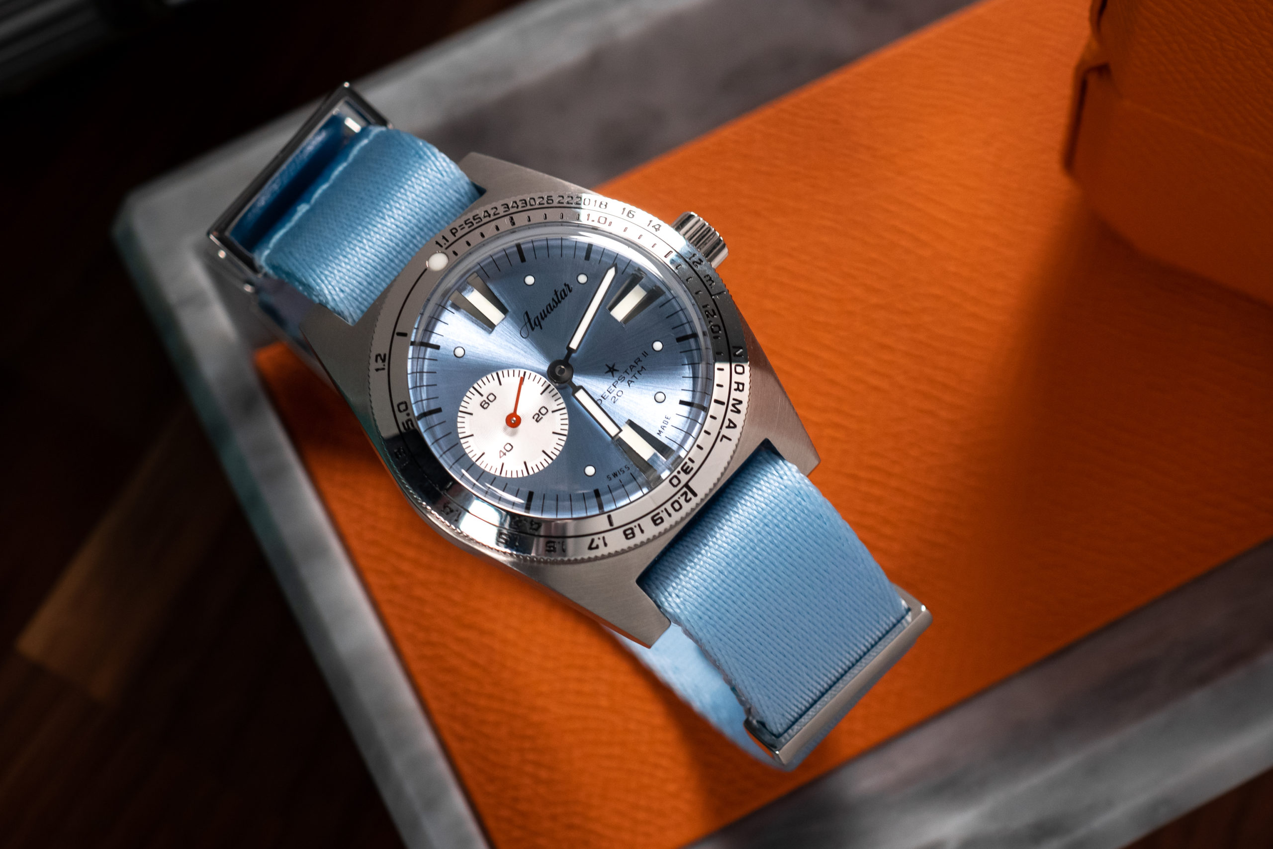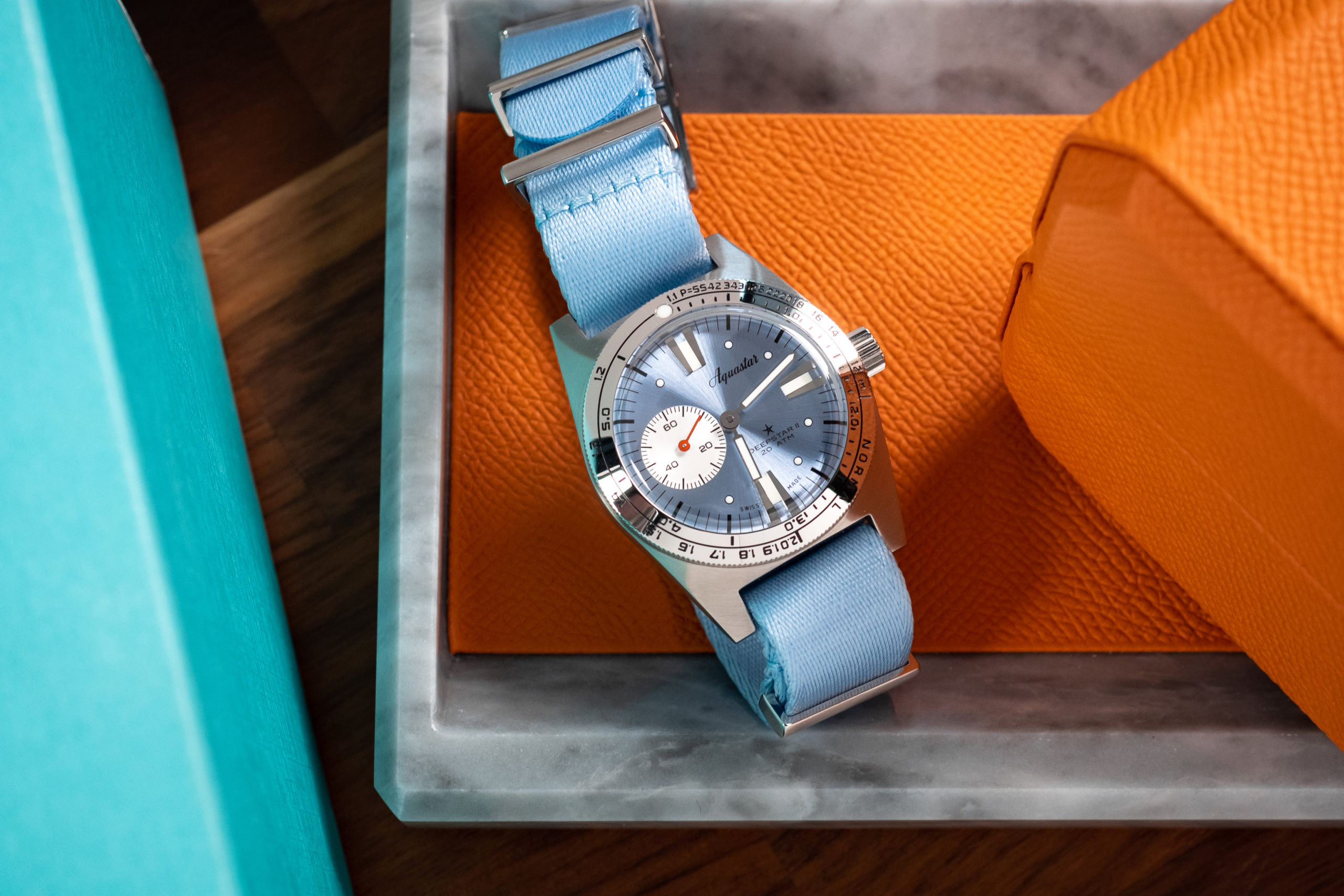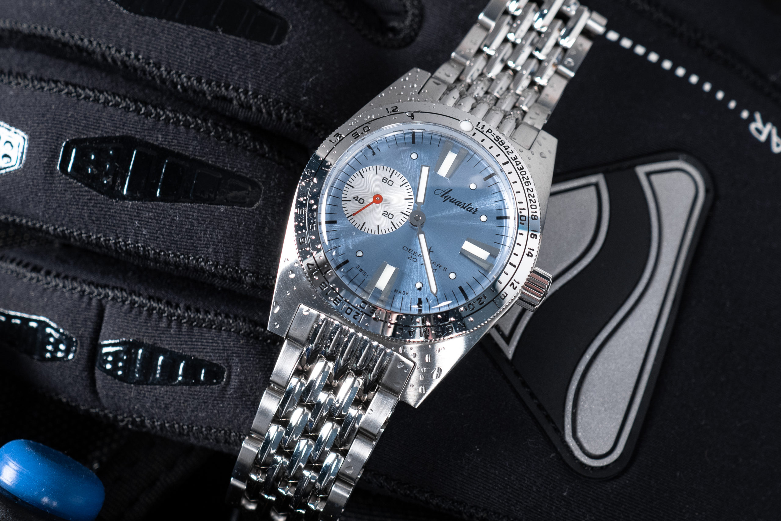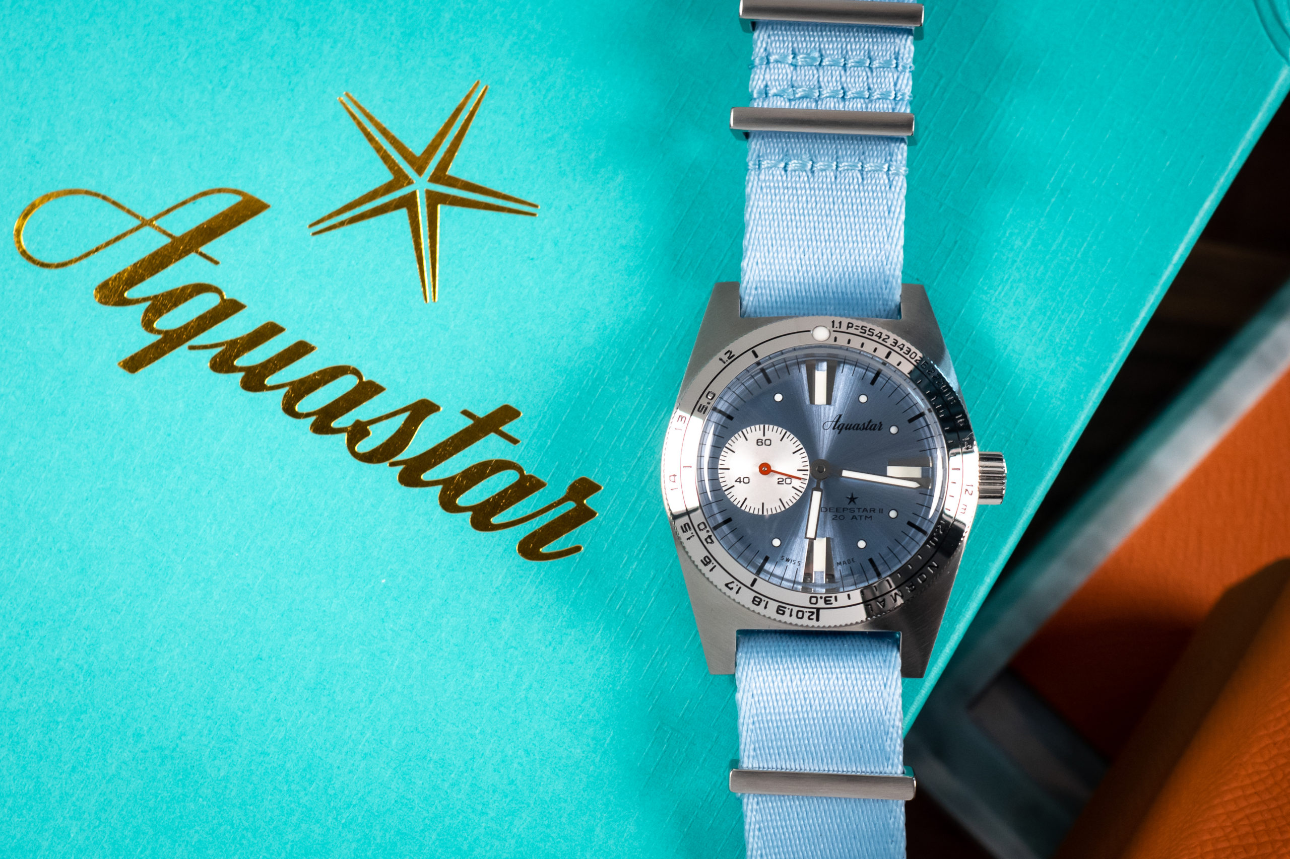 The Fratello × Aquastar Deepstar II Limited Edition has an ice-blue sunburst dial, which is complemented by a red hand on the small seconds sub-dial. Light blue may be incredibly popular today, but the tone wasn’t chosen simply to adhere to current trends; after all, most of the Aquastar releases focus on using darker colors. The cool ice-blue hue will stand the test of time because it works so well with the overall design and becomes oddly versatile for such a light shade. Another distinct difference of the Fratello limited edition is the use of white Super-LumiNova instead of the “old radium” lume used on prior models. This helps lend a more modern feel to the watch and should also satisfy those who desire a fresh look.