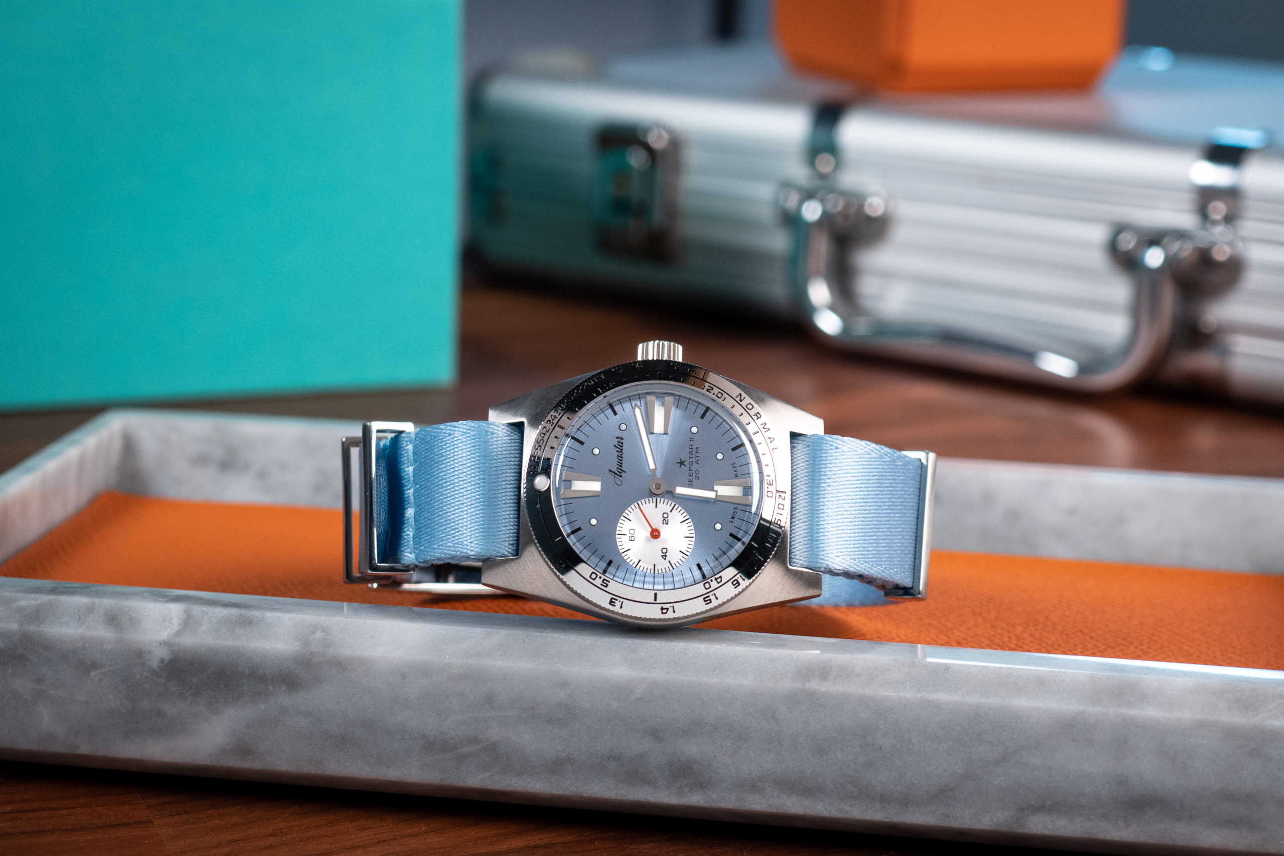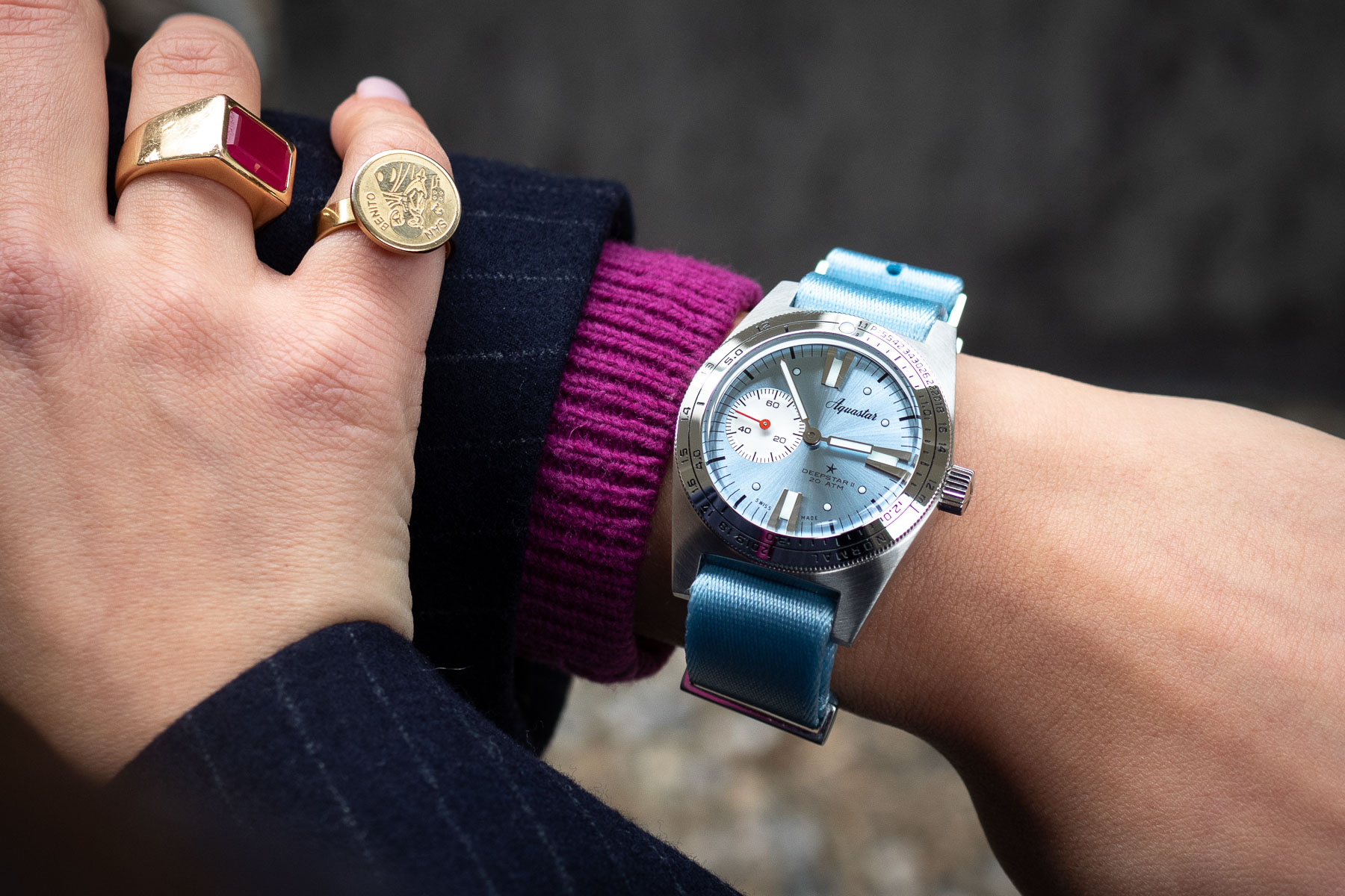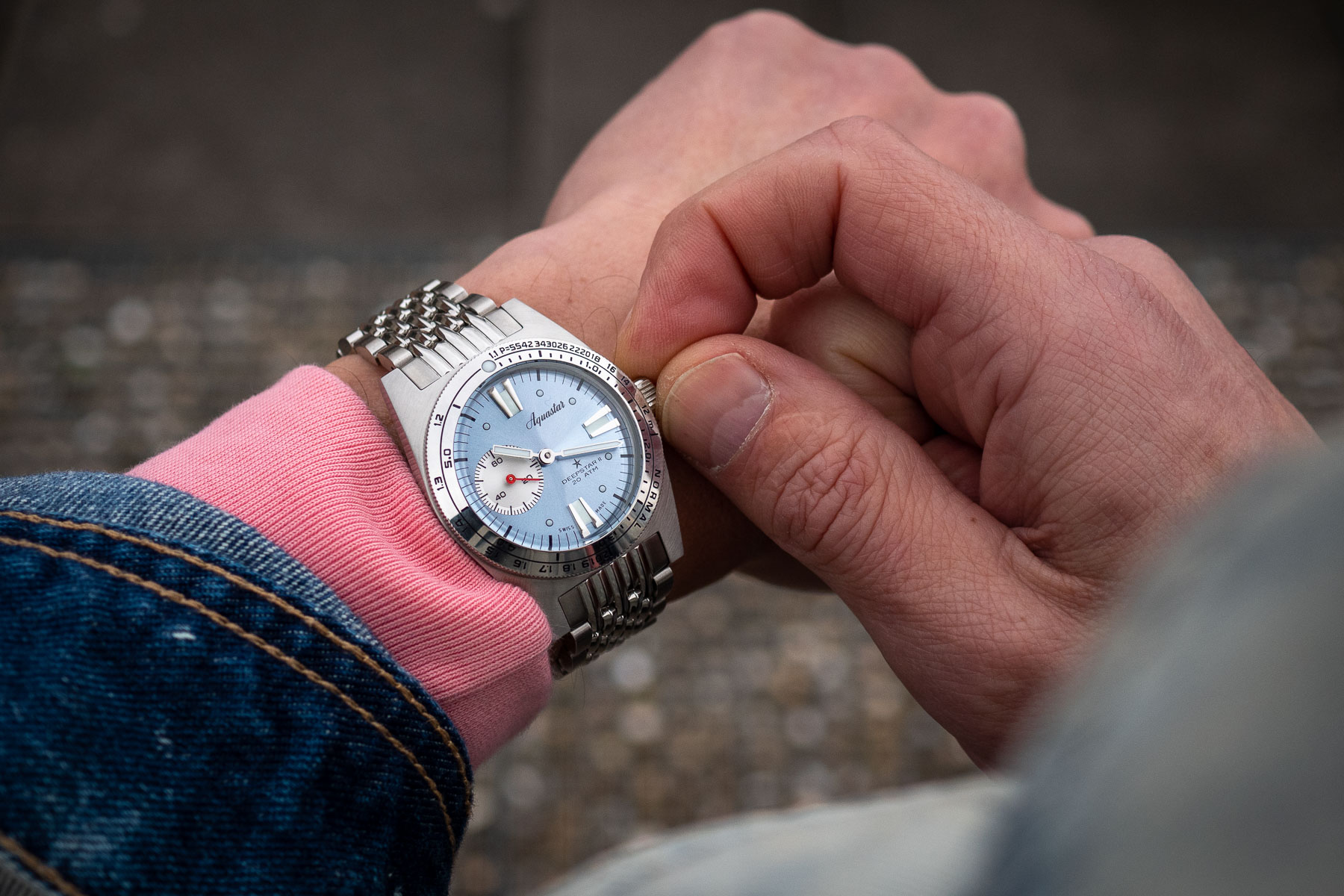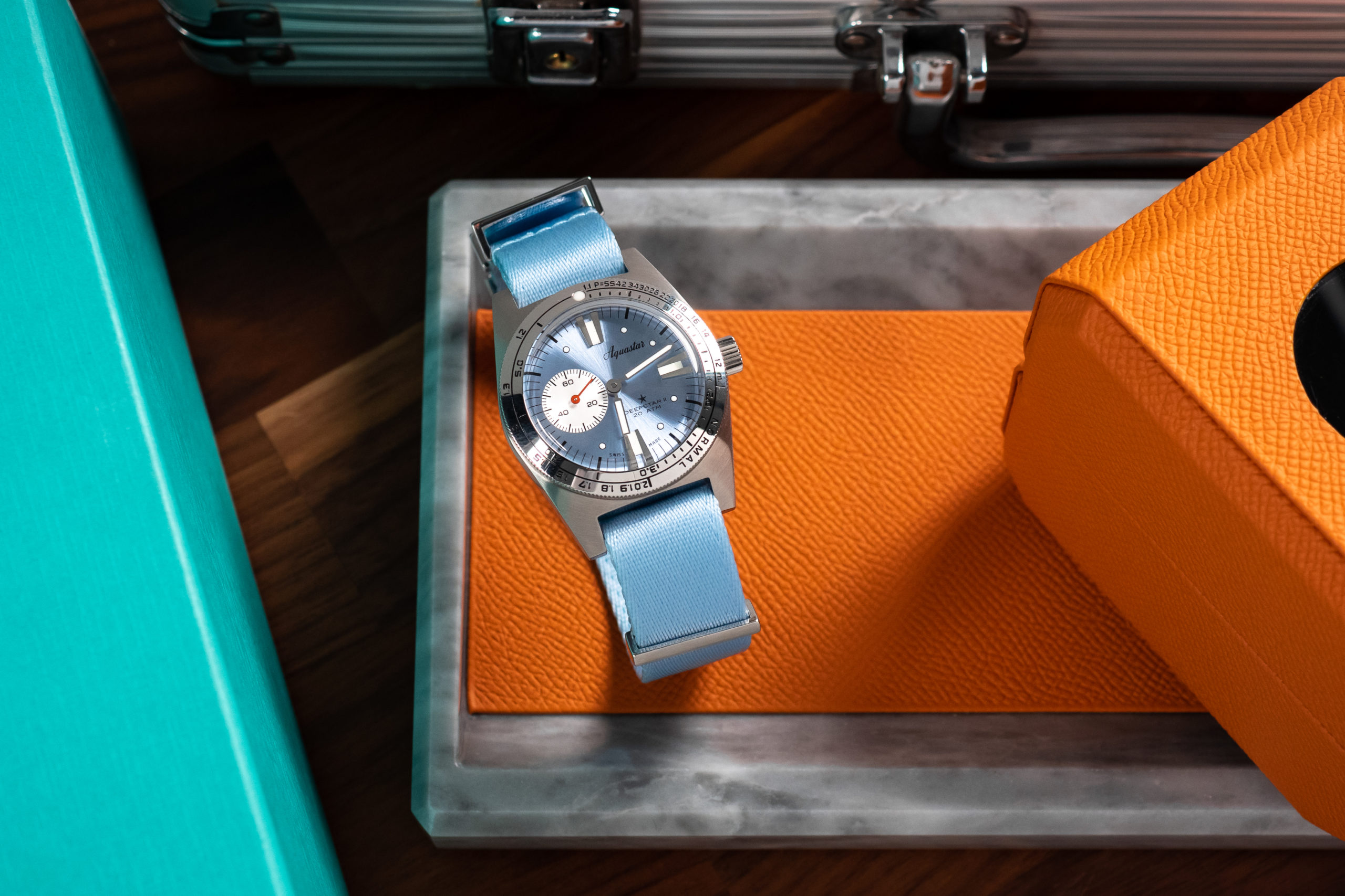 The Fratello × Aquastar Deepstar II Limited Edition has an ice-blue sunburst dial, which is complemented by a red hand on the small seconds sub-dial. Light blue may be incredibly popular today, but the tone wasn’t chosen simply to adhere to current trends; after all, most of the Aquastar releases focus on using darker colors. The cool ice-blue hue will stand the test of time because it works so well with the overall design and becomes oddly versatile for such a light shade. Another distinct difference of the Fratello limited edition is the use of white Super-LumiNova instead of the “old radium” lume used on prior models. This helps lend a more modern feel to the watch and should also satisfy those who desire a fresh look.