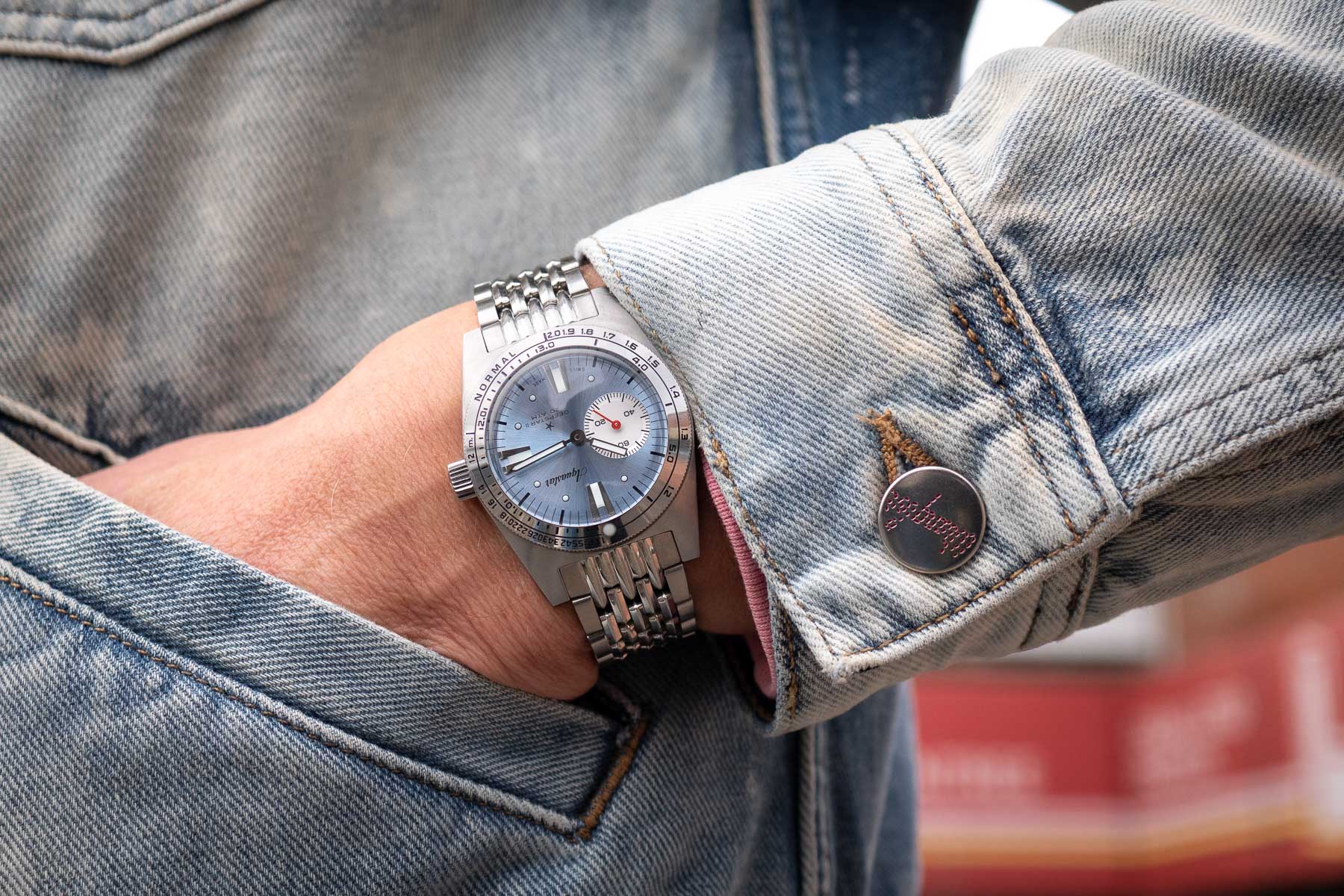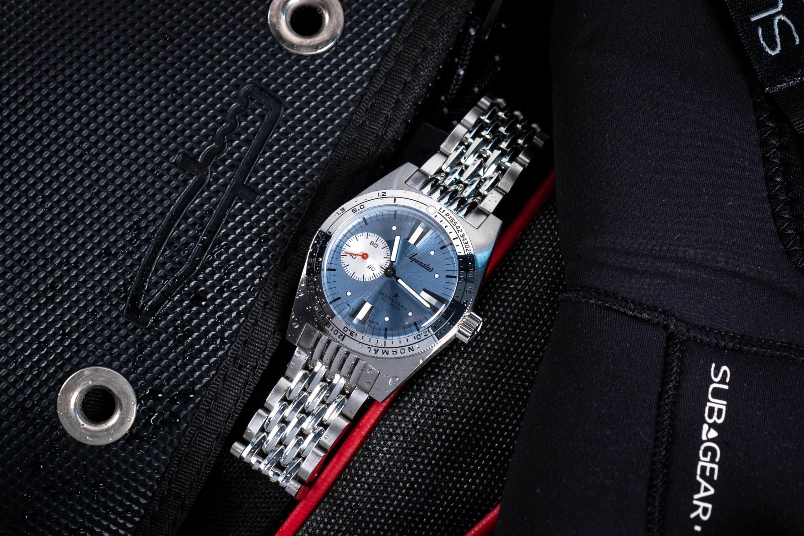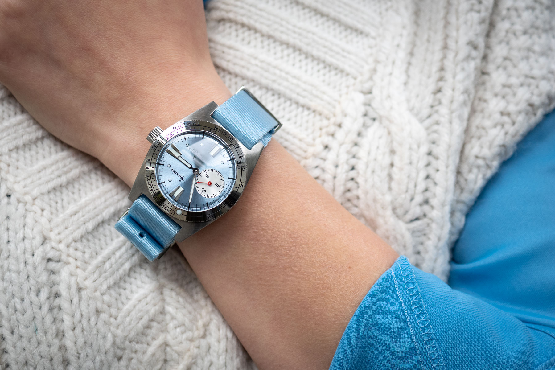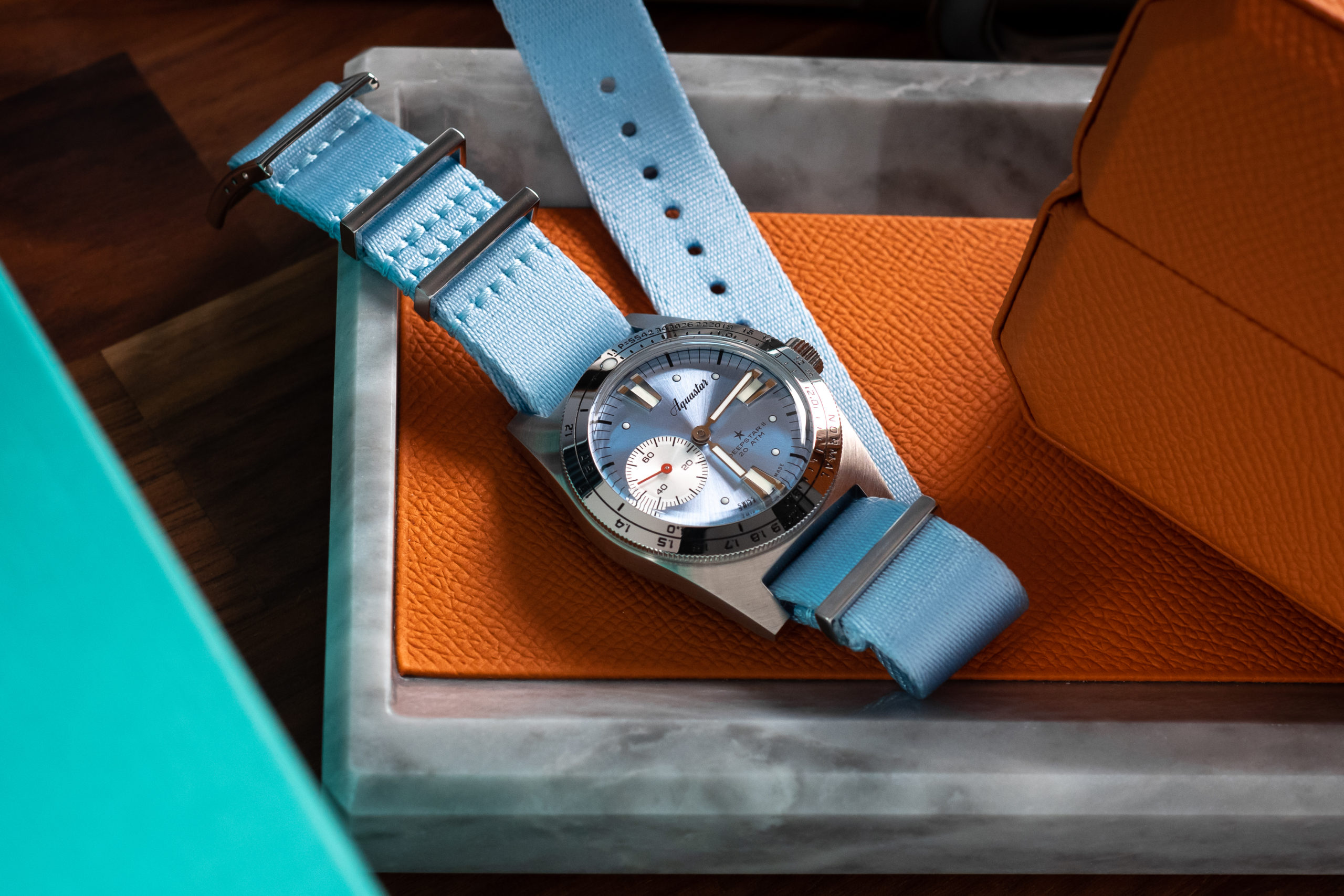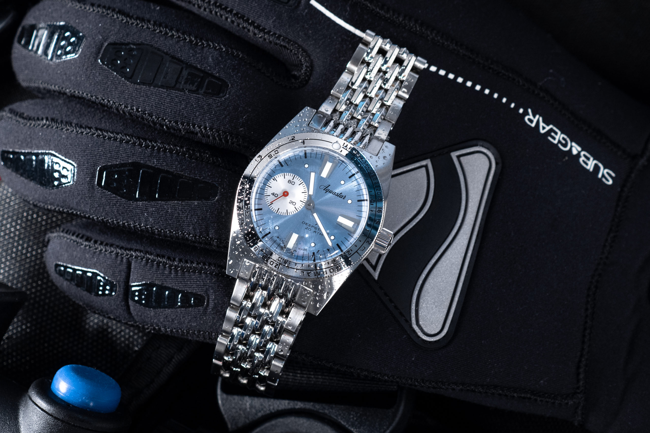 The Fratello × Aquastar Deepstar II Limited Edition has an ice-blue sunburst dial, which is complemented by a red hand on the small seconds sub-dial. Light blue may be incredibly popular today, but the tone wasn’t chosen simply to adhere to current trends; after all, most of the Aquastar releases focus on using darker colors. The cool ice-blue hue will stand the test of time because it works so well with the overall design and becomes oddly versatile for such a light shade. Another distinct difference of the Fratello limited edition is the use of white Super-LumiNova instead of the “old radium” lume used on prior models. This helps lend a more modern feel to the watch and should also satisfy those who desire a fresh look.