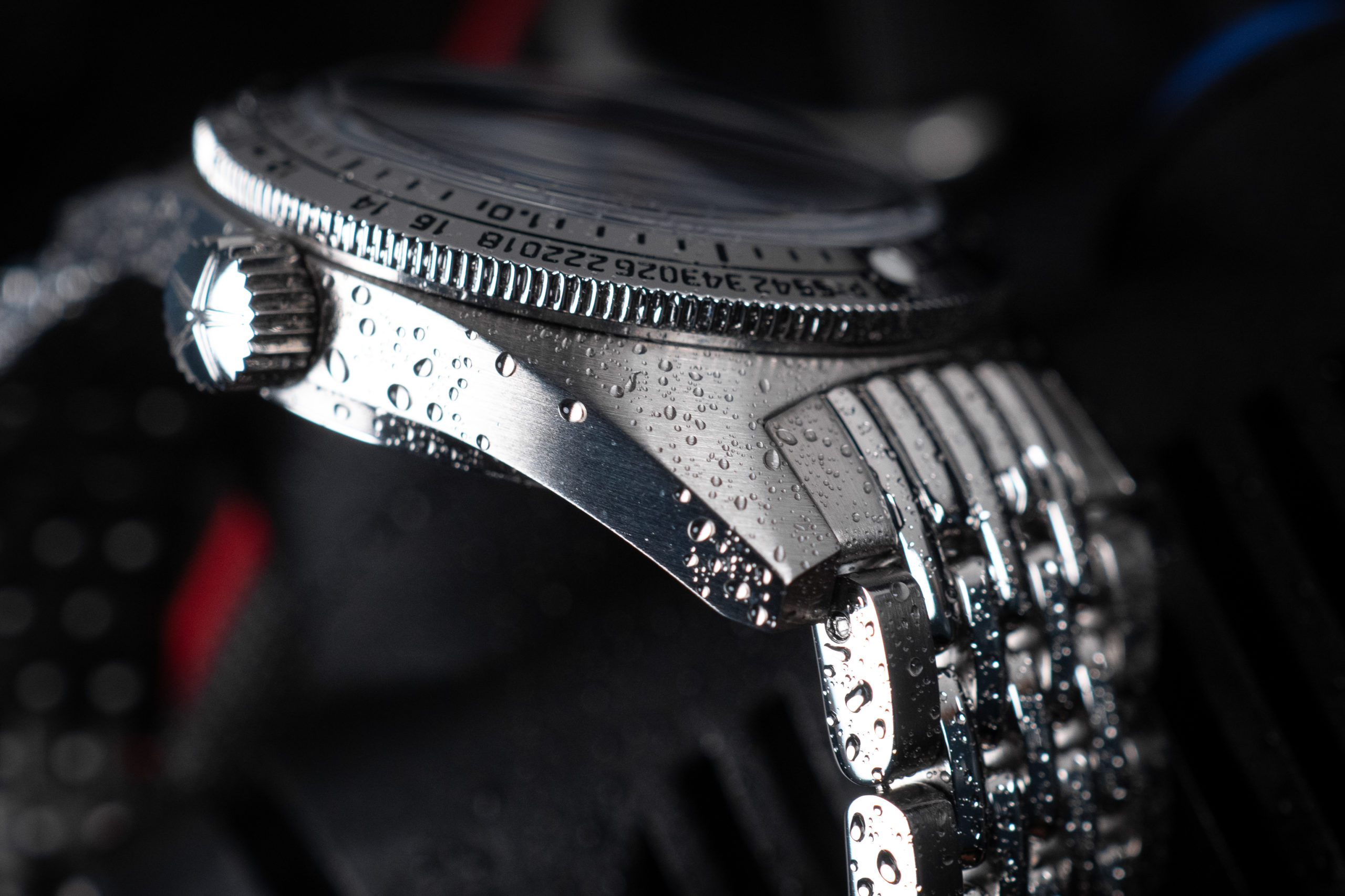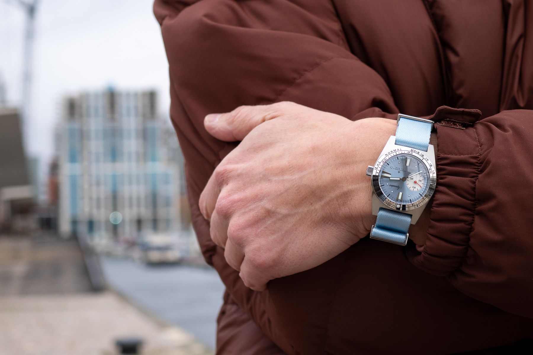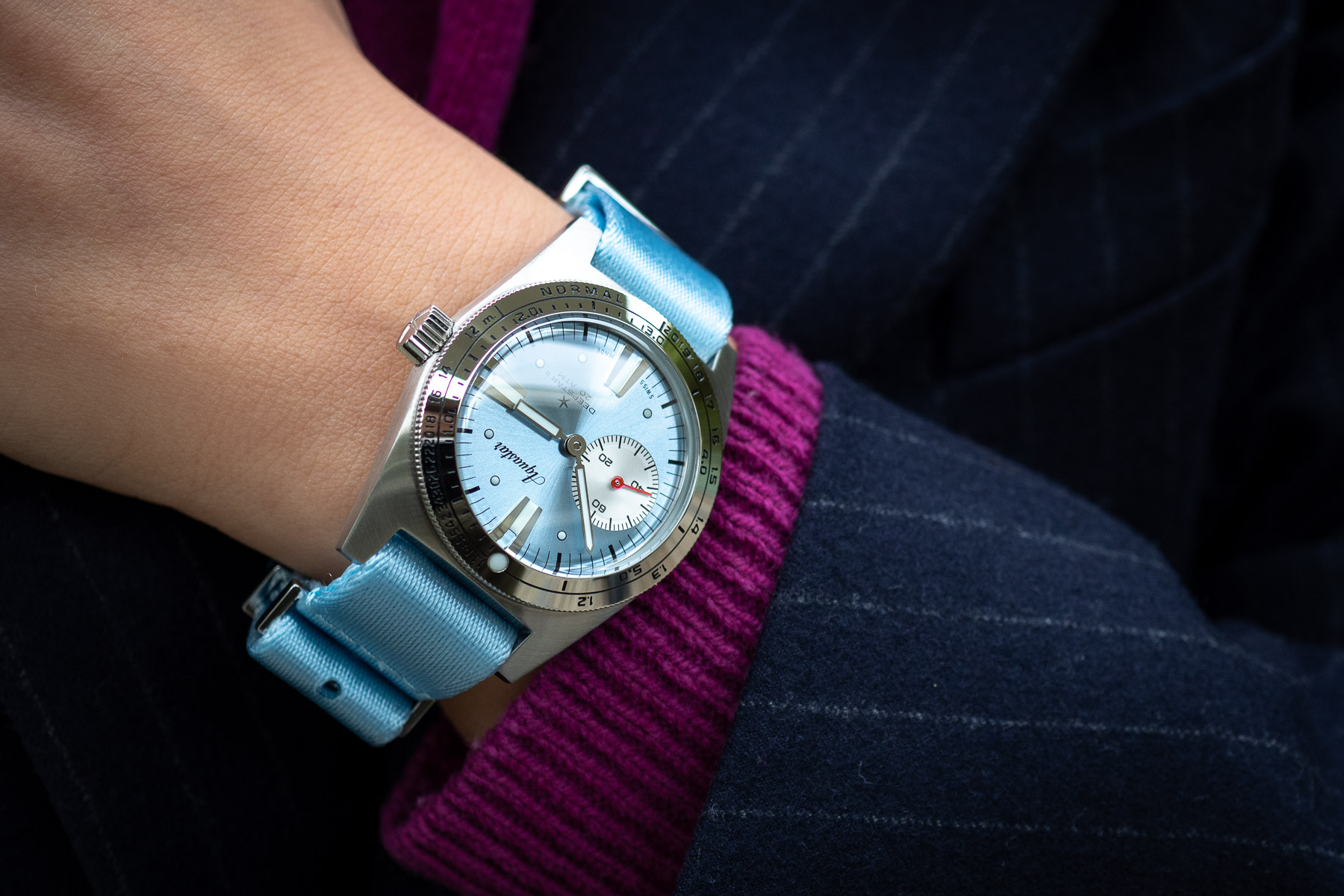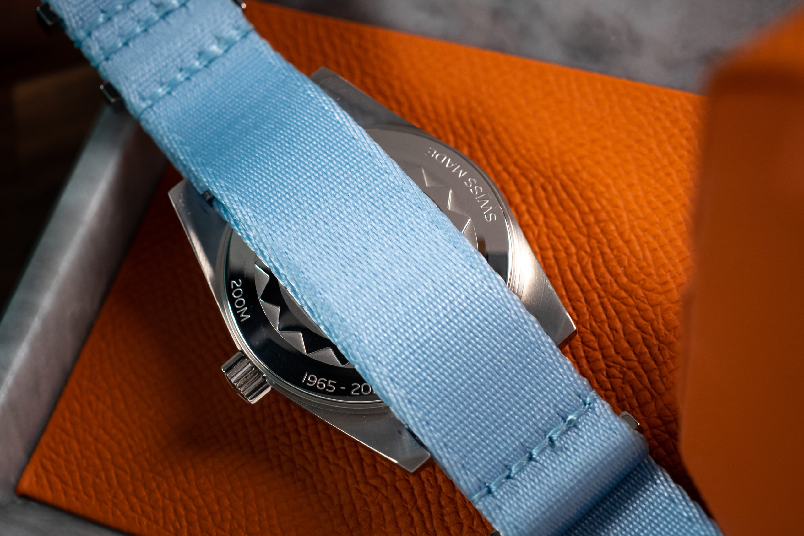 The Fratello × Aquastar Deepstar II Limited Edition has an ice-blue sunburst dial, which is complemented by a red hand on the small seconds sub-dial. Light blue may be incredibly popular today, but the tone wasn’t chosen simply to adhere to current trends; after all, most of the Aquastar releases focus on using darker colors. The cool ice-blue hue will stand the test of time because it works so well with the overall design and becomes oddly versatile for such a light shade. Another distinct difference of the Fratello limited edition is the use of white Super-LumiNova instead of the “old radium” lume used on prior models. This helps lend a more modern feel to the watch and should also satisfy those who desire a fresh look.