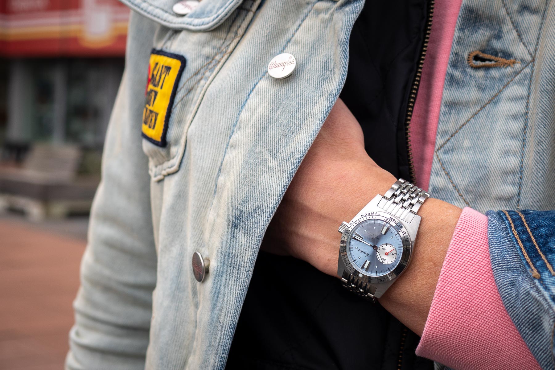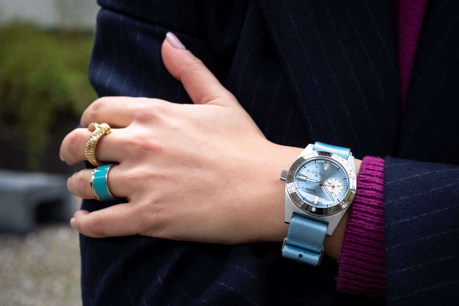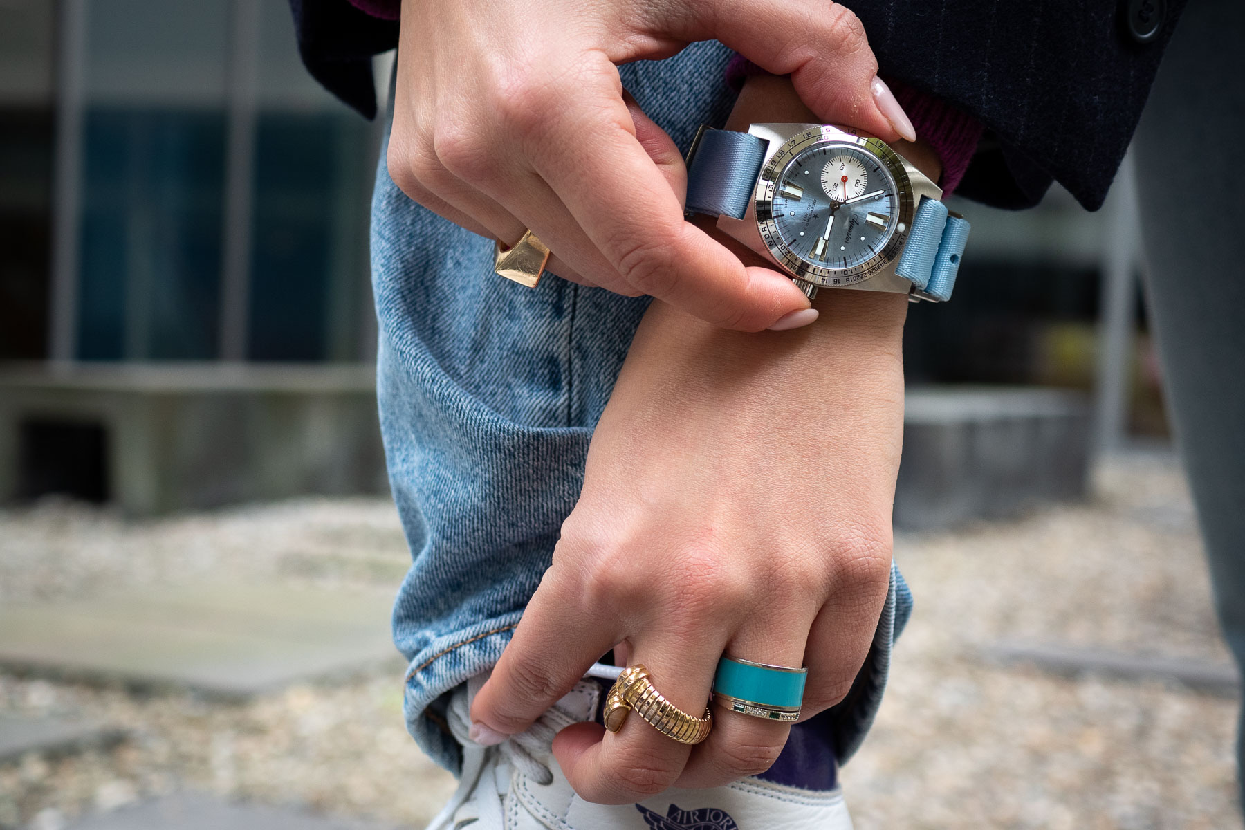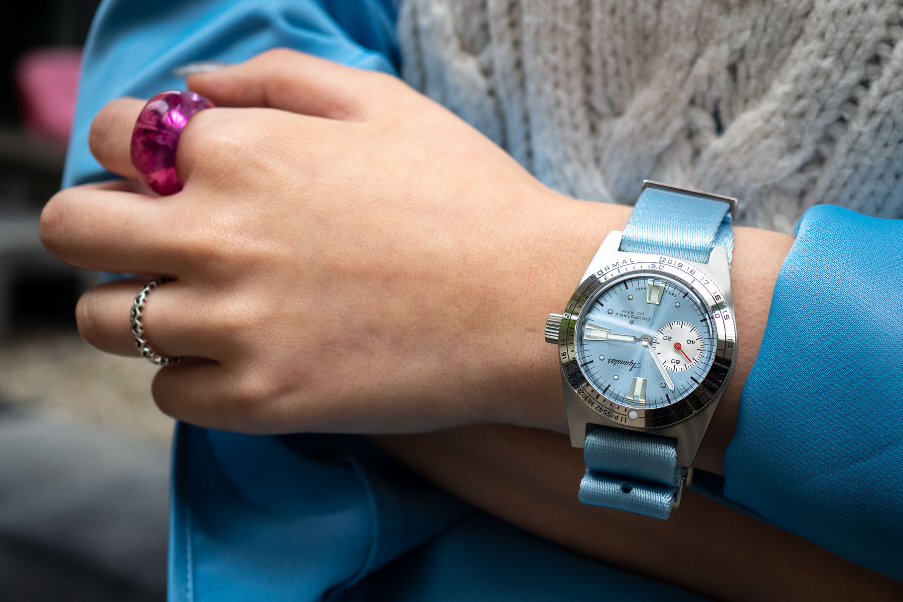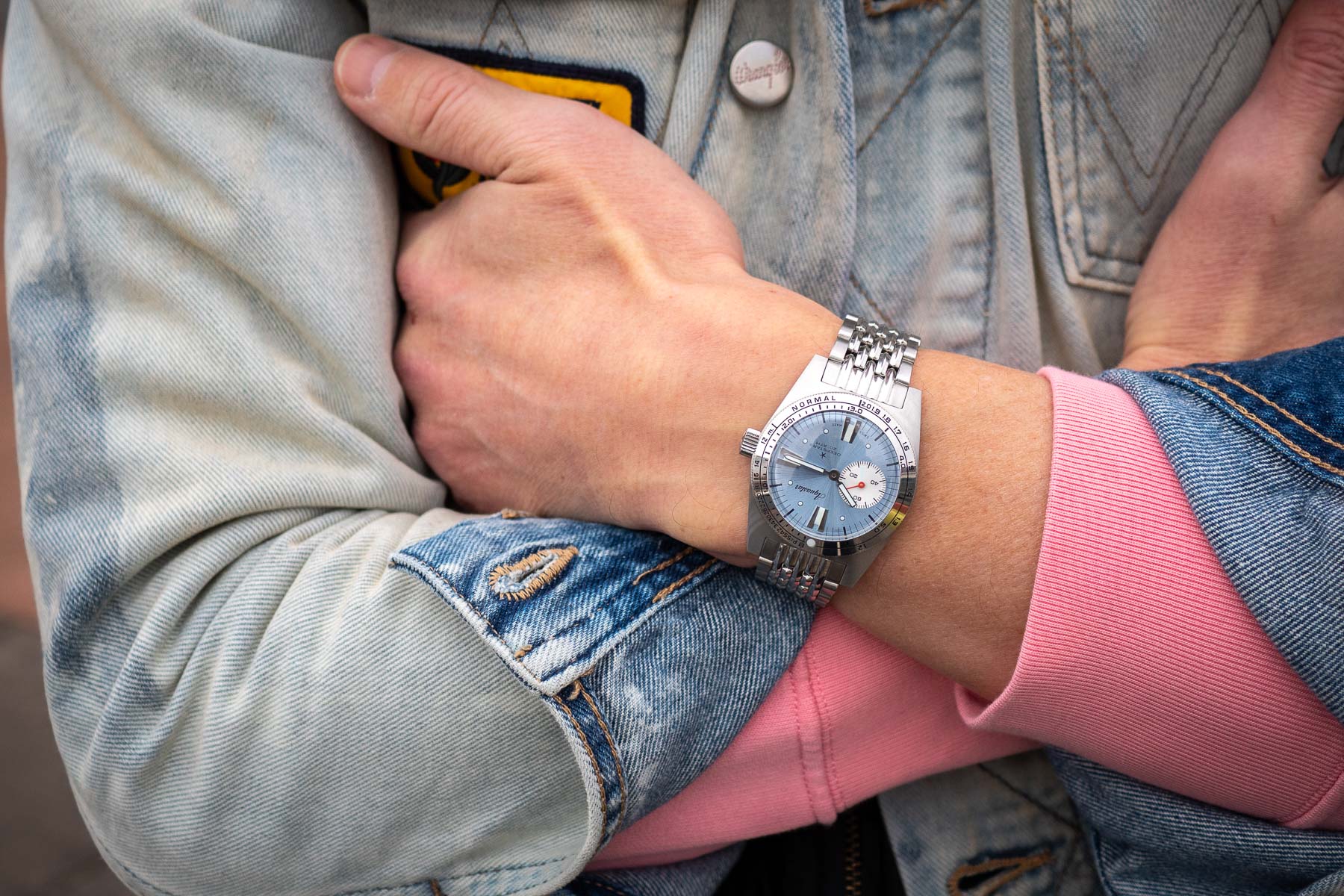 The Fratello × Aquastar Deepstar II Limited Edition has an ice-blue sunburst dial, which is complemented by a red hand on the small seconds sub-dial. Light blue may be incredibly popular today, but the tone wasn’t chosen simply to adhere to current trends; after all, most of the Aquastar releases focus on using darker colors. The cool ice-blue hue will stand the test of time because it works so well with the overall design and becomes oddly versatile for such a light shade. Another distinct difference of the Fratello limited edition is the use of white Super-LumiNova instead of the “old radium” lume used on prior models. This helps lend a more modern feel to the watch and should also satisfy those who desire a fresh look.