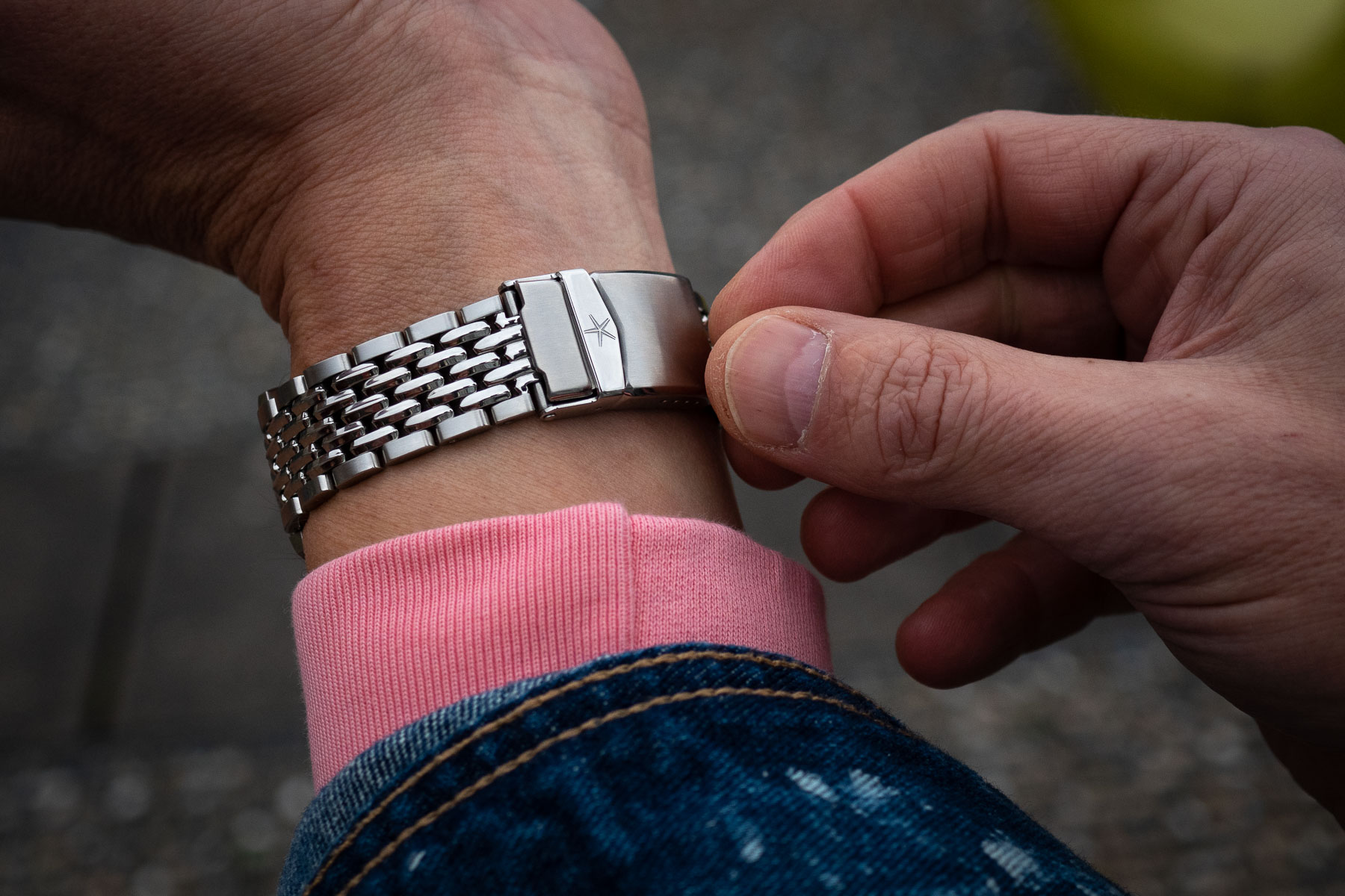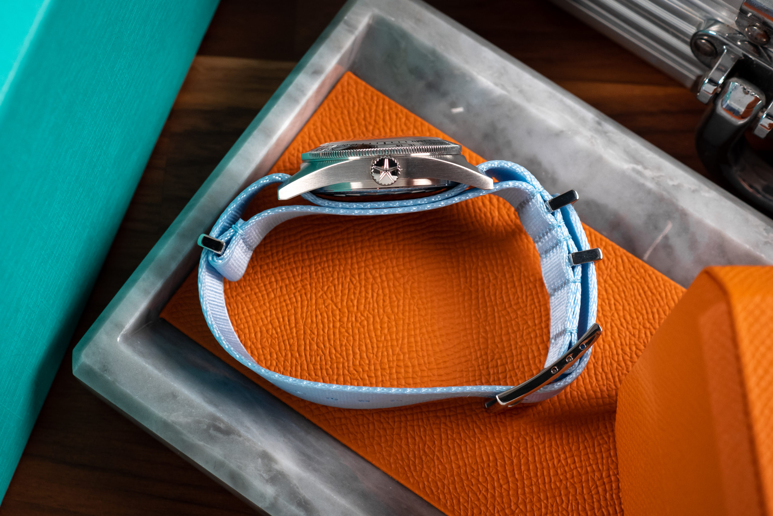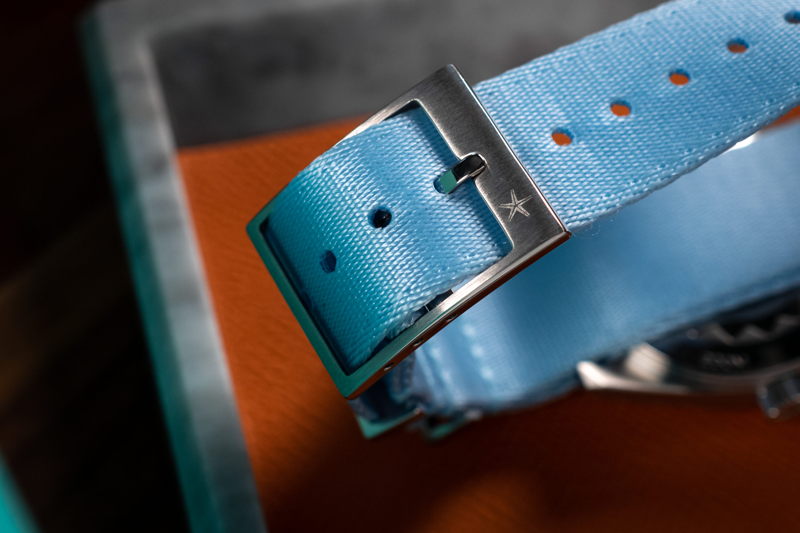 STRAP: Stainless steel 19mm “beads-of-rice” bracelet: signed safety clasp and 19mm ice blue seatbelt NATO with signed pin buckle