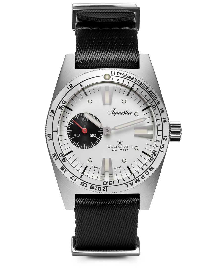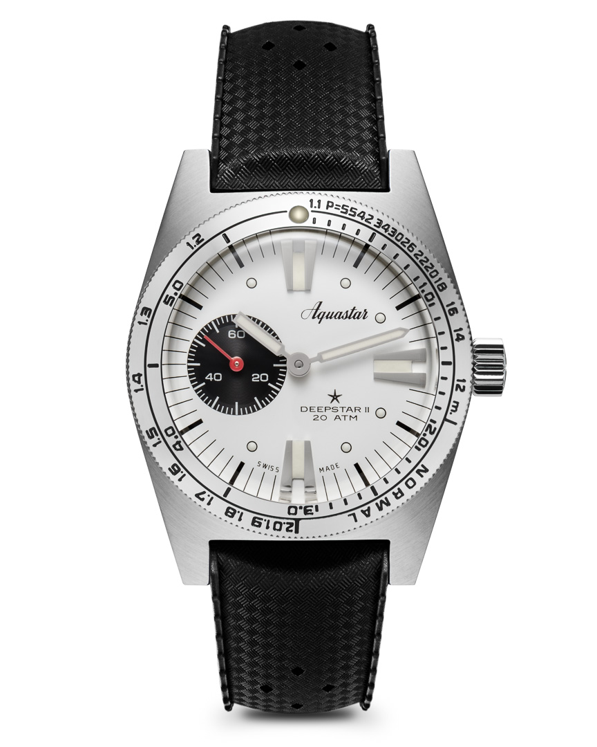 The Aquastar Deepstar II is the evolution of the original Deepstar from 1963, relying on the same patent of the original piece that enables calculating multiple dive and decompression times while housing a non-chronograph, easy to use 3 hand mechanism, and moderately sized 37mmX46mm for great comfort of wear. Being a result of recreation of one of the most influential dive watches of the 60s, the unique and uncluttered mono sub dial, and the patented multiple dive decompression bezel table make the Deepstar an unmatched diver-oriented tool with an instantly recognizable design.
