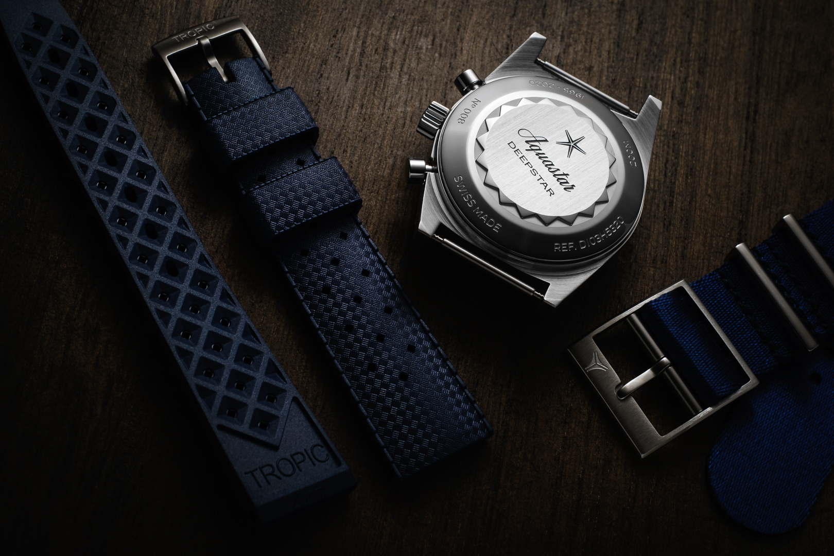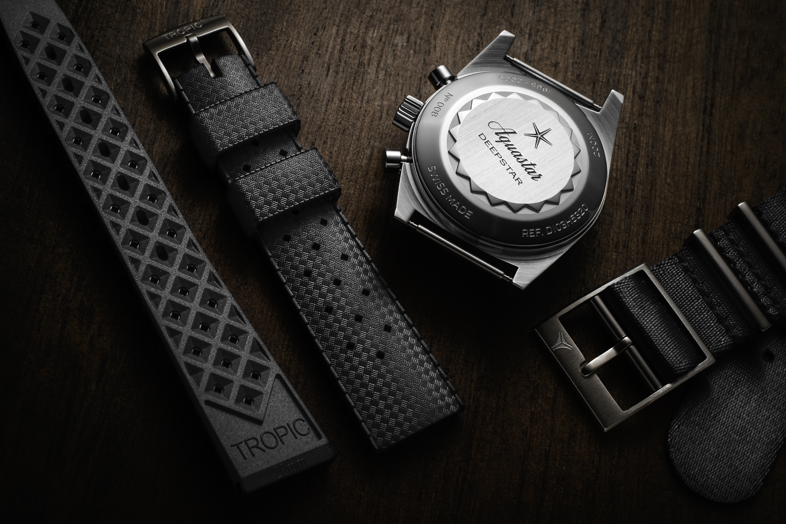 Here you can choose to add an additional Tropic strap for the Aquastar Deepstar matching the colors in light grey, steel grey, vintage black and blue ray